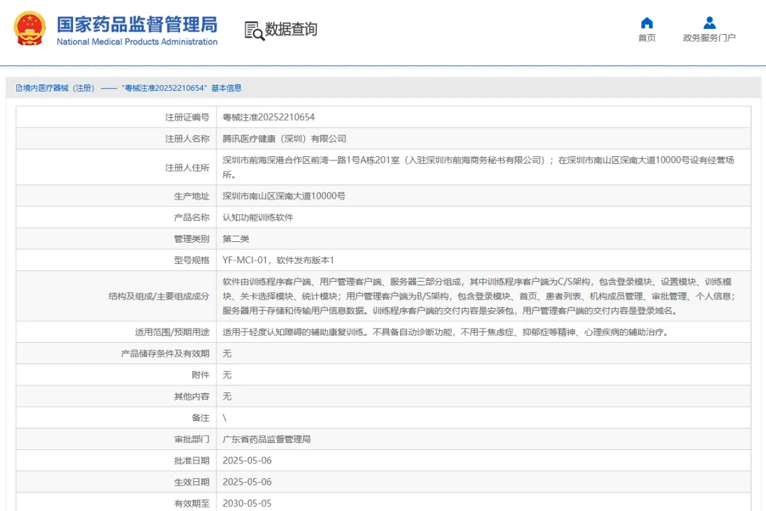 近期,經(jīng)國(guó)家藥品監(jiān)督管理局公示,騰訊醫(yī)療健康(深圳)有限公司自主研發(fā)的認(rèn)知功能訓(xùn)練軟件(粵械注準(zhǔn)20252210654)獲得NMPA批準(zhǔn)上市,奧泰康提供MA解決方案。