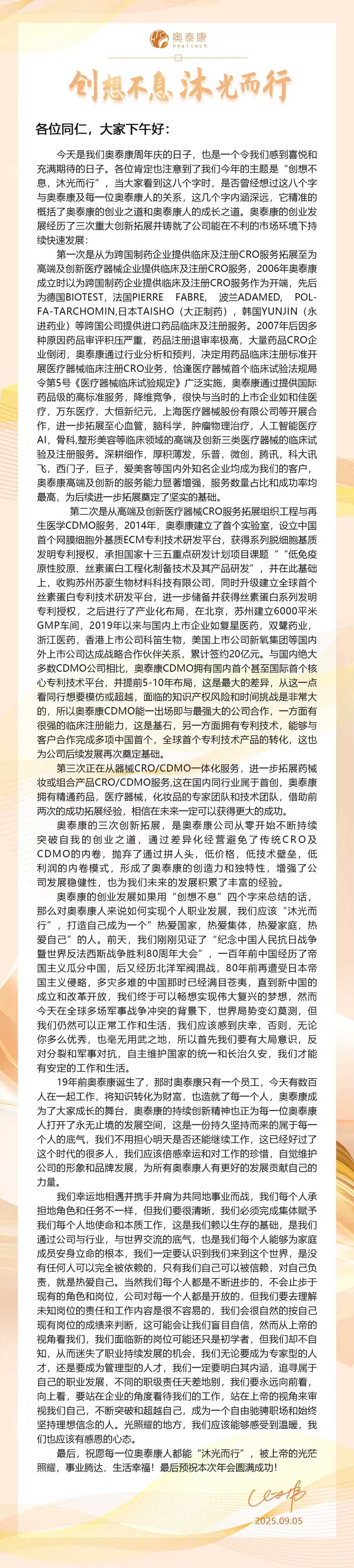 饒義偉先生講到,在這個(gè)喜悅而充滿期待的奧泰康周年慶之日,我們以“創(chuàng)想不息,沐光而行”為主題,回顧過(guò)去、展望未來(lái)。奧泰康的創(chuàng)業(yè)歷程經(jīng)歷了三次關(guān)鍵創(chuàng)新拓展:從為跨國(guó)藥企提供藥品CRO服務(wù),拓展高端及創(chuàng)新醫(yī)療器械臨床與注冊(cè)CRO服務(wù),以國(guó)際標(biāo)準(zhǔn)降維競(jìng)爭(zhēng),服務(wù)眾多知名企業(yè);進(jìn)而拓展組織工程與再生醫(yī)學(xué)研發(fā)及生產(chǎn)CDMO服務(wù),憑借核心專利技術(shù)和前瞻布局,與國(guó)內(nèi)外上市公司達(dá)成戰(zhàn)略合作;如今正進(jìn)一步拓展藥械妝或組合產(chǎn)品的CRO/CDMO一體化服務(wù),開(kāi)創(chuàng)行業(yè)先河。這些突破避免了同質(zhì)化競(jìng)爭(zhēng),奠定了奧泰康獨(dú)特的創(chuàng)造力和穩(wěn)健的發(fā)展基礎(chǔ)。